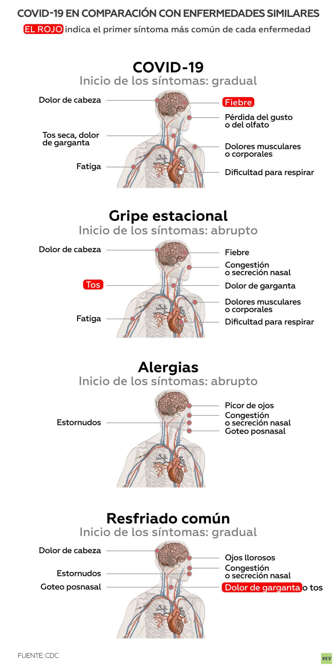 En la siguiente infografía se enumeran los síntomas de diferentes enfermedades: el Covid-19, la gripe estacional, el resfriado común y las alergias. No obstante, cabe mencionar que estas listas de síntomas, así como el orden en que aparecen, no son infalibles. Por ejemplo, un porcentaje de personas que padecen covid-19 son asintomáticas, y algunas no desarrollan fiebre en absoluto, mientras que hay pacientes con gripe que no tienen tos.