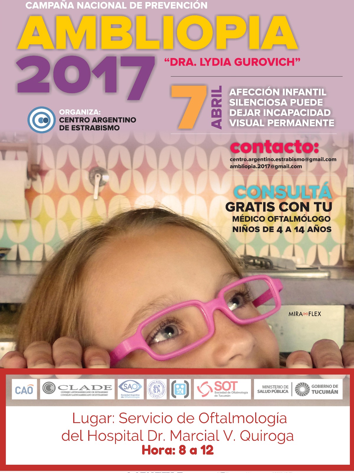 El próximo viernes 7 de abril de 8 a 12 en el Servicio de Oftalmología del Hospital Marcial Quiroga, se realizará la Campaña Nacional de Prevención de Ambliopía 2017 “Dra Lydia Gurovich”, dirigida a niños de 4 a 14 años, con el fin de detectar la enfermedad silenciosa que puede causar ceguera total. La atención será gratuita y por orden de llegada. Quienes asistan deberán llevar DNI.