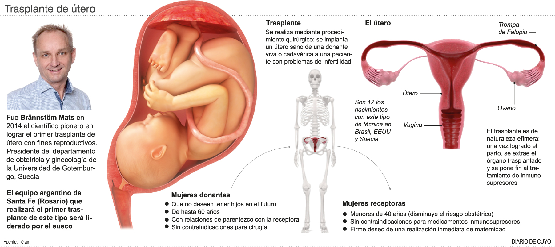 Experimentado en humanos desde el año 2000, el trasplante uterino consiste en implantar un órgano de una donante viva o cadavérica a una paciente que no puede quedar embarazada por "factor uterino absoluto" que "representa el 4% de los casos de infertilidad femenina".