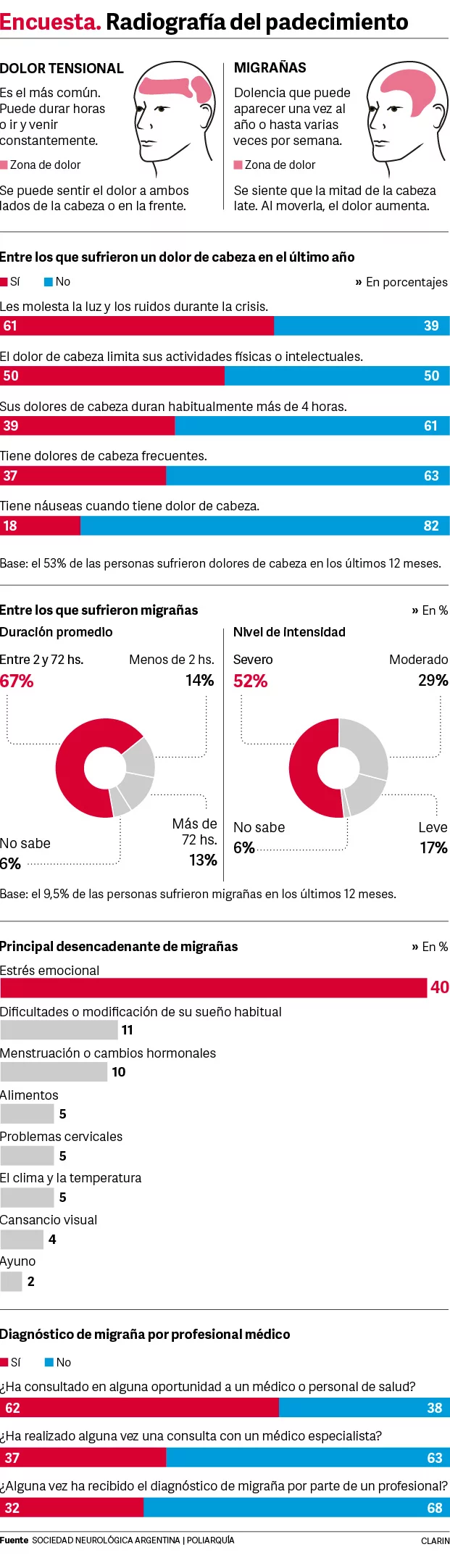 “Necesitaría arrancarme la cabeza”, le describió, con lágrimas en los ojos, a la médica de guardia que intentaba atajar su cuadro a las 4 de la madrugada. Para la mujer de treinta y largos, el dolor de cabeza era insoportable: no podía dormir y llevaba casi 72 horas así. Le preguntó: “Del uno al diez, ¿cuánto te duele?” Y ella: “Veinte”. Había probado con frío, con calor; con reposo y actividad. Con ayuno, con dulce y con salado. Había tomado los mil y un analgésicos. Nada. ¿Es un caso aislado? Una encuesta de la consultora Poliarquía hecha sobre 2.500 casos reveló, en abril pasado, que el 53% de los argentinos había sufrido cefalea en el último año. Pero la contracara de la “masificación” del dolor de cabeza es que muchos pacientes que padecen cuadros menos "livianos" ignoren la real causa -y la potencial gravedad- de esos episodios. Porque mientras la cefalea suele ser el síntoma de cuadros múltiples y bien conocidos (insolación, malestar estomacal, gripe, hipertensión…), también puede ser producto de un par de enfermedades propias de la predisposición biológica de la persona.