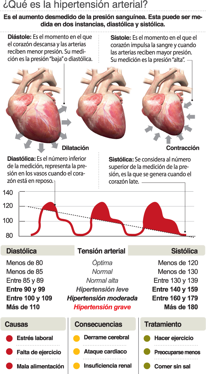 ‘La hipertensión puede producir complicaciones en el sistema nervioso central, generando demencia o ACV. A nivel oftalmológico, complicaciones en la vista, provocar ceguera. También complicaciones a nivel vascular y arterial, a nivel cardiaco como problemas coronarios, infartos o arritmias, y disfunción en los riñones’, indicó Martínez.’ Esta enfermedad ‘no tiene cura’ pero puede prevenirse con hábitos de vida saludables y tratarse con tratamiento farmacológico indicado’, aseguró Martínez.