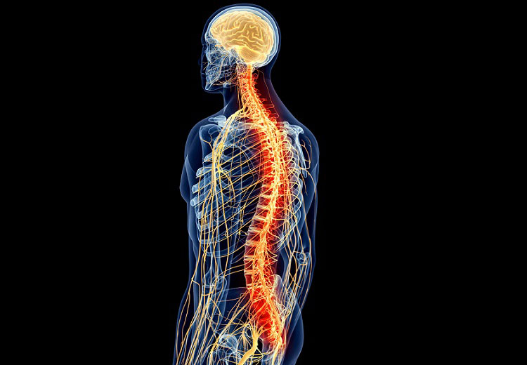 El sistema nervioso central comprende el cerebro y la médula espinal. La médula espinal, compuesta de tejido blando y rodeada de huesos (vértebras), se extiende desde la base del cerebro hacia abajo y está compuesta de neuronas y grupos de nervios llamados "vías", las cuales llegan hasta diferentes partes del cuerpo. Las vías de la médula espinal transmiten mensajes entre el cerebro y el resto del cuerpo. Las vías motoras transmiten señales desde el cerebro para controlar el movimiento de los músculos. Las vías sensoriales transmiten señales, desde las partes del cuerpo hacia el cerebro, relacionadas con el calor, el frío, la presión, el dolor y la posición de las extremidades.
