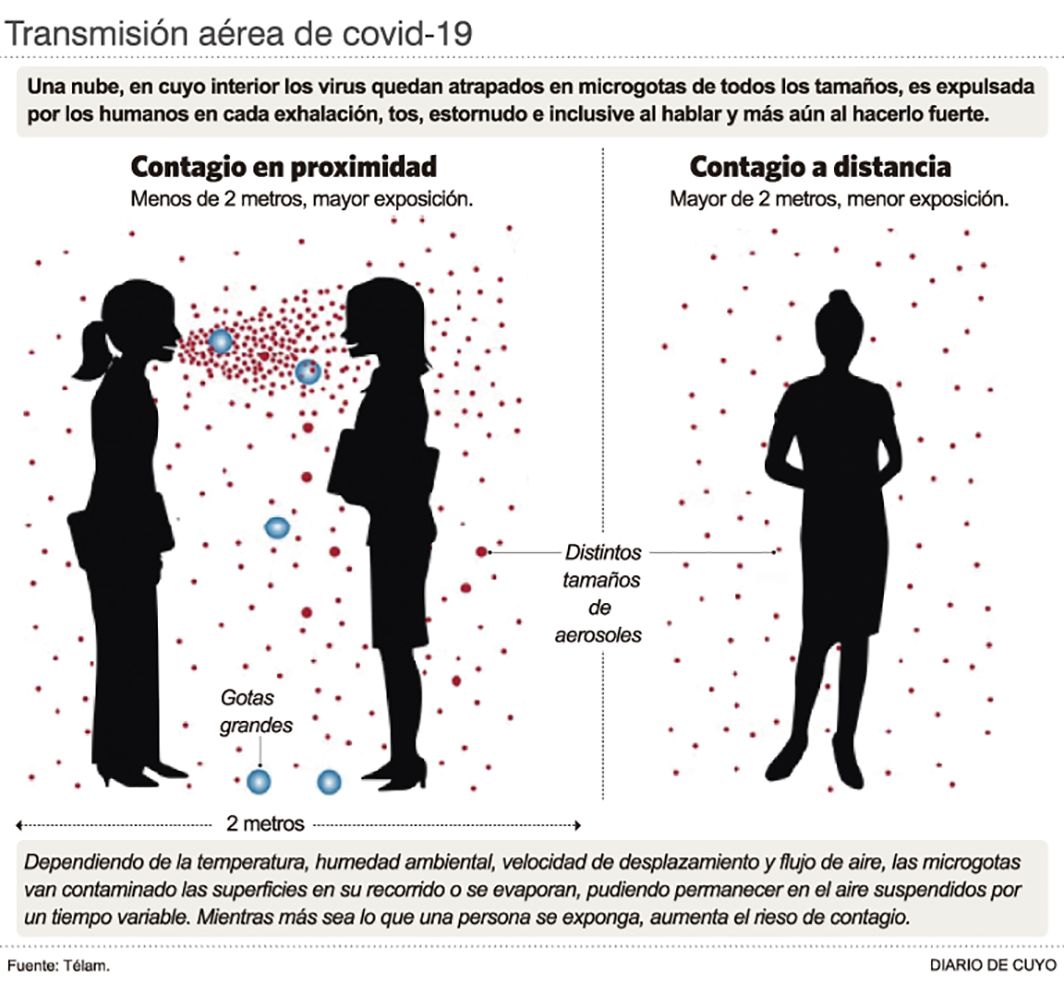 "Hay que distinguir dos tipos de contagio: en proximidad y a distancia. Al exhalar emitimos aerosoles o pequeñas partículas de fluido respiratorio que pueden contener virus infectivo. El contagio por aerosoles en proximidad es el que ocurre a menos de dos metros de la persona infectada, donde la concentración de aerosoles exhalados es mayor y por lo tanto, el riesgo de exposición es alto", señaló a Télam Andrea Pineda Rojas, investigadora del Conicet. Y continuó: "En ambientes cerrados y mal ventilados, esos aerosoles se van acumulando en el aire y aunque estemos a más de dos metros de distancia del otro, al respirar podemos terminar inhalando suficiente cantidad como para contagiarnos, esto es lo que denominamos contagio a distancia".