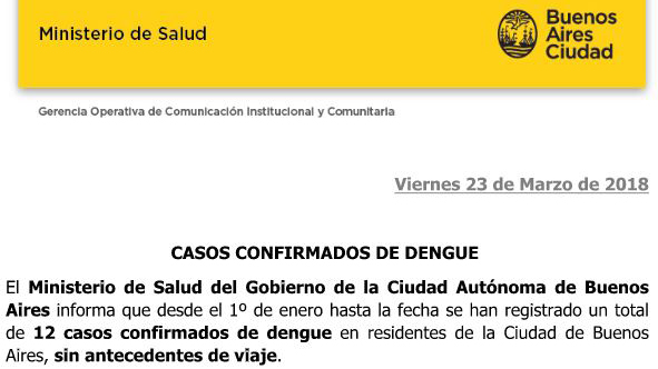 Según confirmó el pasado viernes el Ministerio de Salud del Gobierno de la Ciudad Autónoma de Buenos Aires, desde el 1 de enero hasta el 23 de marzo se registró un total de 12 casos confirmados de dengue en residentes de la Ciudad de Buenos Aires, sin antecedentes de viaje.