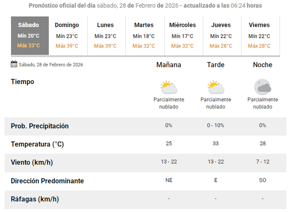 Según lo que indica el Servicio Meteorológico Nacional, para este sábado 28 de febrero de 2026, se espera en San Juan que la máxima alcance los 33°C , en tanto que la mínima está pronosticada en 20°C.