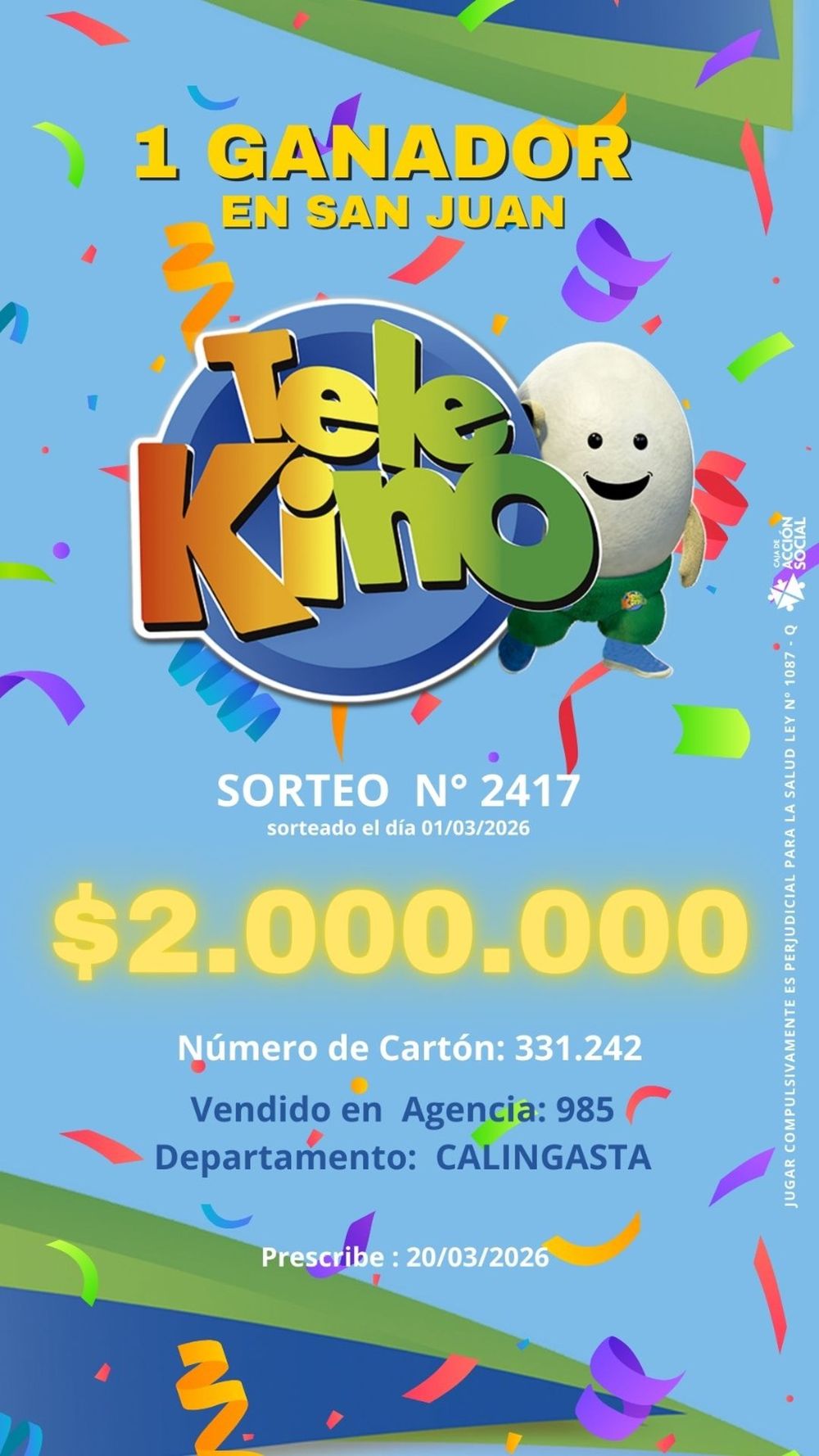 Según la información oficial, el cartón ganador fue el N° 331.242, vendido en la Agencia 985, en el departamento Calingasta. El premio prescribe el 20 de marzo de 2026, por lo que el beneficiario deberá presentarse antes de esa fecha para hacerlo efectivo.