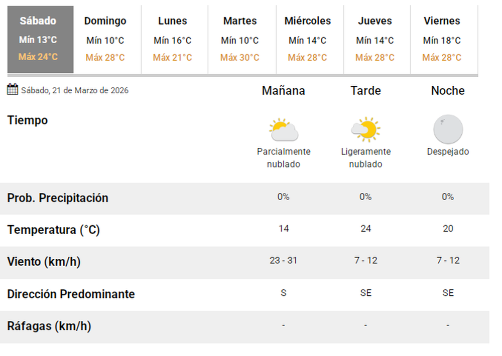 La jornada comenzará con una mínima de 13 °C y cielo parcialmente nublado. Con el correr de las horas, el tiempo se mantendrá con nubosidad variable, dando paso a una tarde ligeramente nublada, donde la temperatura alcanzará una máxima de 24 °C.