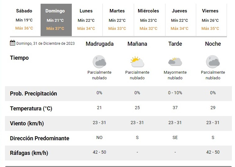 El informe indica que este domingo el viento dirá presente durante todo el día, sobre todo en la noche. Así las cosas, el último día del año arrancará con viento del sector Noroeste, con ráfagas de hasta 50 kilómetros por hora. Tras eso, se espera cielo parcialmente nublado y calor, con una máxima que rondará los 37 grados.
