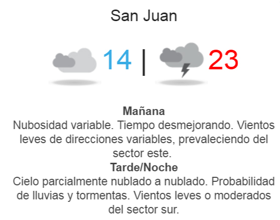 Parece que los días de viento, calor y buen tiempo tienen las horas contadas en San Juan. Es que el Servicio Meteorológico Nacional anuncia para este sábado lluvias, especialmente en la tarde-noche. La temperatura máxima se ubicará en torno a los 23°.
