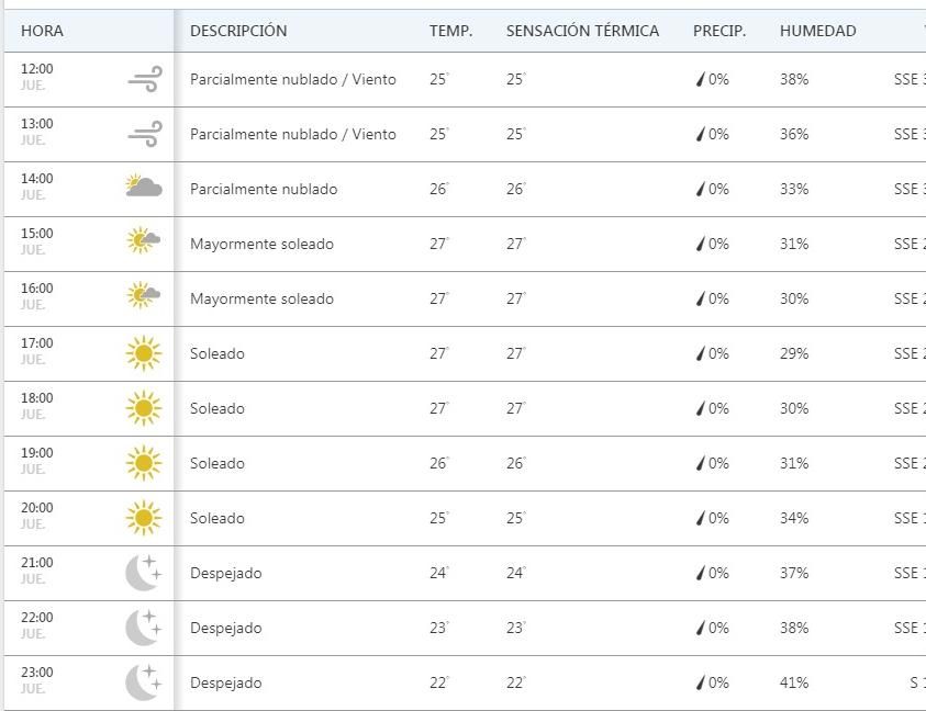 En cuanto a los próximos días, se espera un viernes algo nublado con máxima de 30 grados, un sábado con condiciones similares y un domingo muy cálido, con temperatura máxima de 35 grados y probabilidad de tormentas aisladas durante la noche.