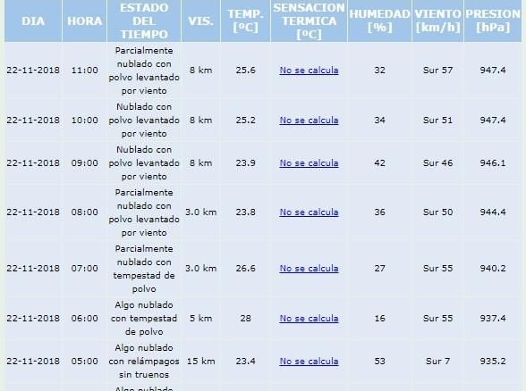 Sin embargo, pasadas las 10 volvió a aumentar hasta los 51 km/h y la velocidad máxima (al menos hasta el mediodía), se registró a las 11 y fue de 57 km/h.