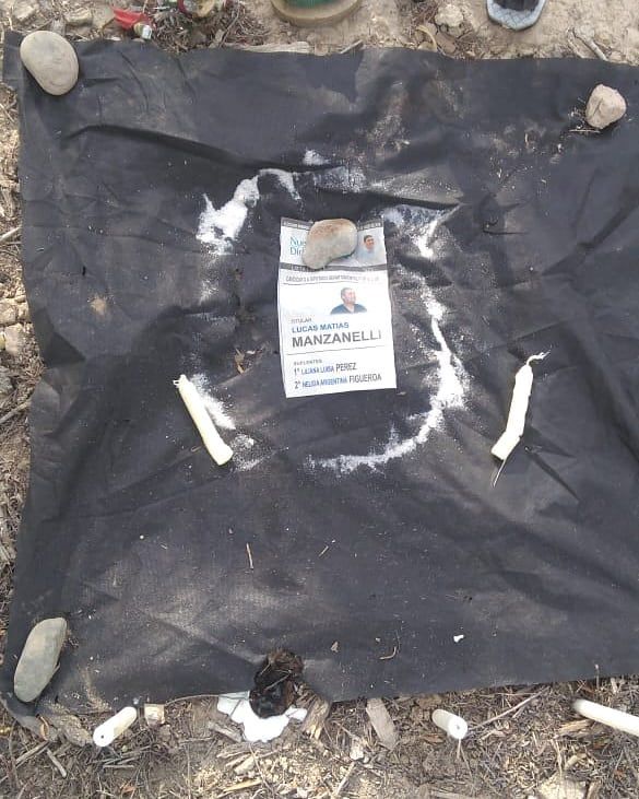 En una manta negra, sal, velas e imágenes rotas de San Expedito y San La Muerte, rodeando el voto del, hasta ese momento precandidato a diputado, fueron hallados en inmediaciones del Club Caza y Pesca del departamento de Ullum.