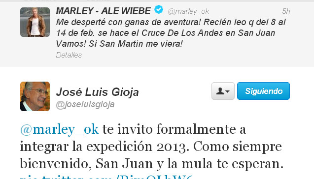 Más tarde, el gobernador José Luis Gioja le respondió la inquietud y lo invitó formalmente. “Te invito formalmente a integrar la expedición 2013. Como siempre bienvenido, San Juan y la mula te esperan”, twiteó con una foto del cruce.