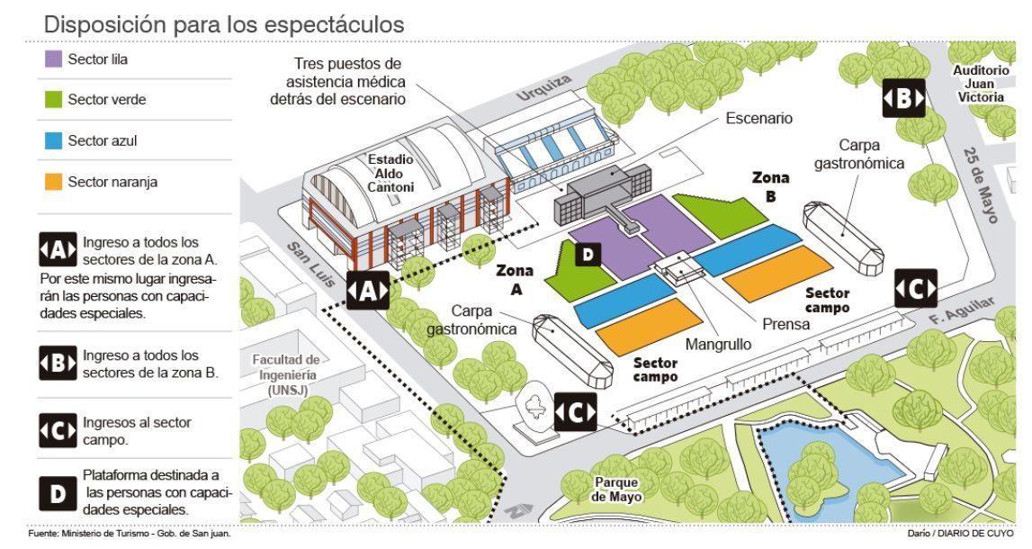 Como todos los años, el escenario principal de la Feria de la Fiesta Nacional del Sol estará ubicado en el sector Oeste del exestadio abierto y tendrá varios ingresos. Los shows, como la Exposición, se desarrollarán entre el 20 y el 23 de febrero.