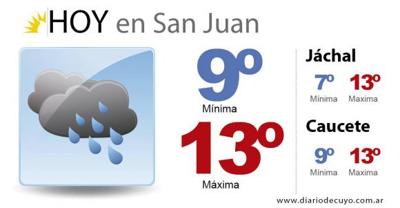 Para hoy se anunció una temperatura máxima de sólo 13 grados con vientos leves del sector Sur y probabilidad de lluvias durante toda la jornada. Dentro del pronóstico se incluye la posibilidad de "algunas nevadas" en la zona Oeste de San Juan.