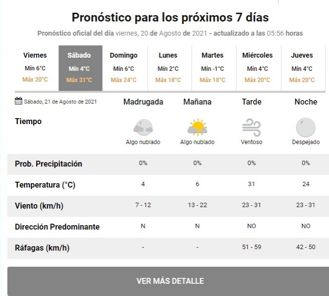 De acuerdo al informe, mañana la máxima trepará a los 31 grados y por la tarde llegará el viento Zonda "con intensidades que oscilarán entre 30 y 40 km/h, mientras que las ráfagas podrán alcanzar los 70 km/h. Este fenómeno puede provocar reducción de la visibilidad".