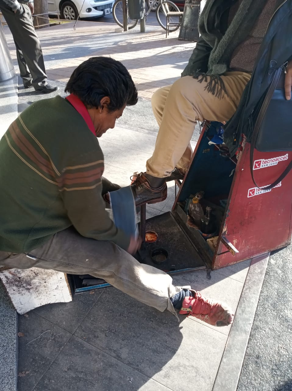 Sergio tiene la cara renegrida y un frondoso pelo entrecano, las manos negras por usarlas para poner la pomada y, al contrario de lo que podría ser, no guarda los secretos del trabajo, no es tacaño con sus conocimientos: por 30 pesos, un joven pituco se llevó los zapatos resplandecientes y varios tips para mantenerlos así por mucho tiempo.