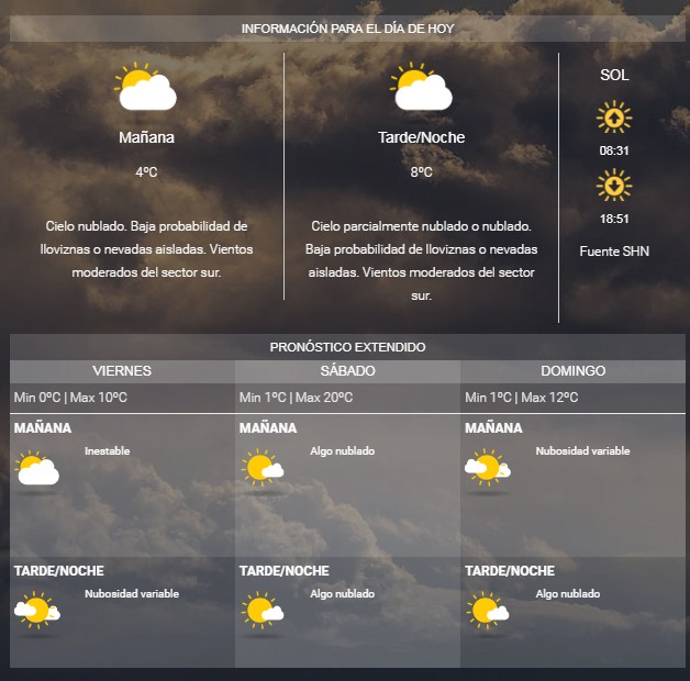 Sin embargo, después de las 8 el texto cambió a “cielo nublado. Baja probabilidad de lloviznas o nevadas aisladas. Vientos moderados del sector sur”. Mientras que, la temperatura a esa hora era de 4,4 grados y para la tarde se espera una máxima de 8 grados.