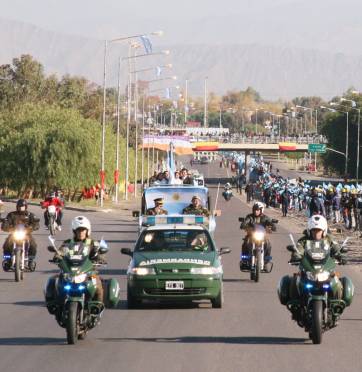 La caravana que transitó la Circunvalación antes del Himno Nacional se formó raudamente con las banderas que estuvieron en la ceremonia central como protagonistas: la del Ministerio de Educación, la provincial, la del RIM 22, la de la columna Cabot del Ejército, la de la Armada Argentina, la de la Delegación San Juan de la Policía Federal, la de la Policía de San Juan y la de la Escuela de Cadetes de la Policía. Cada una fue arriba de una movilidad, que recorrió la avenida lentamente para que todos los asistentes al abrazo pudieran vitorearlas.