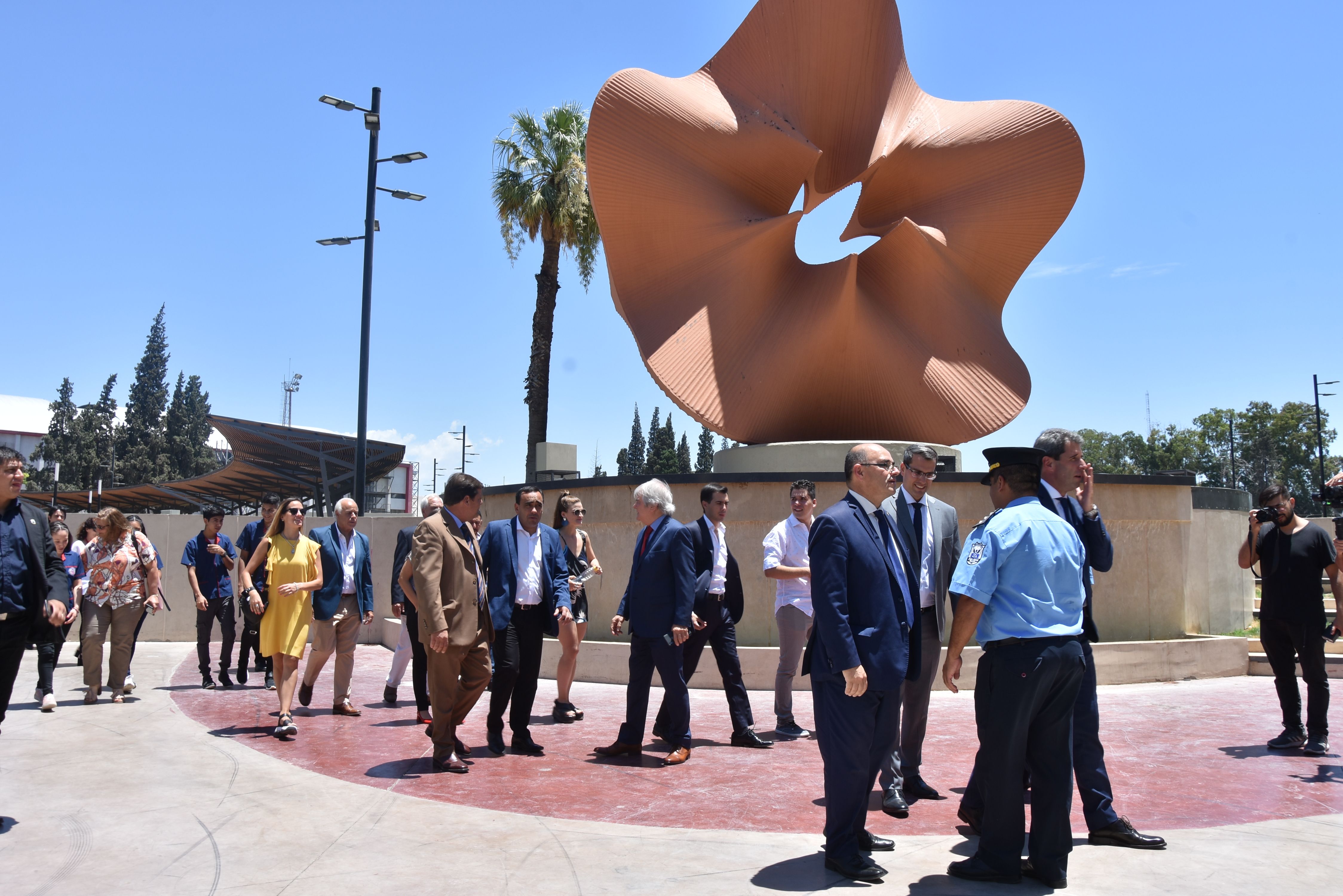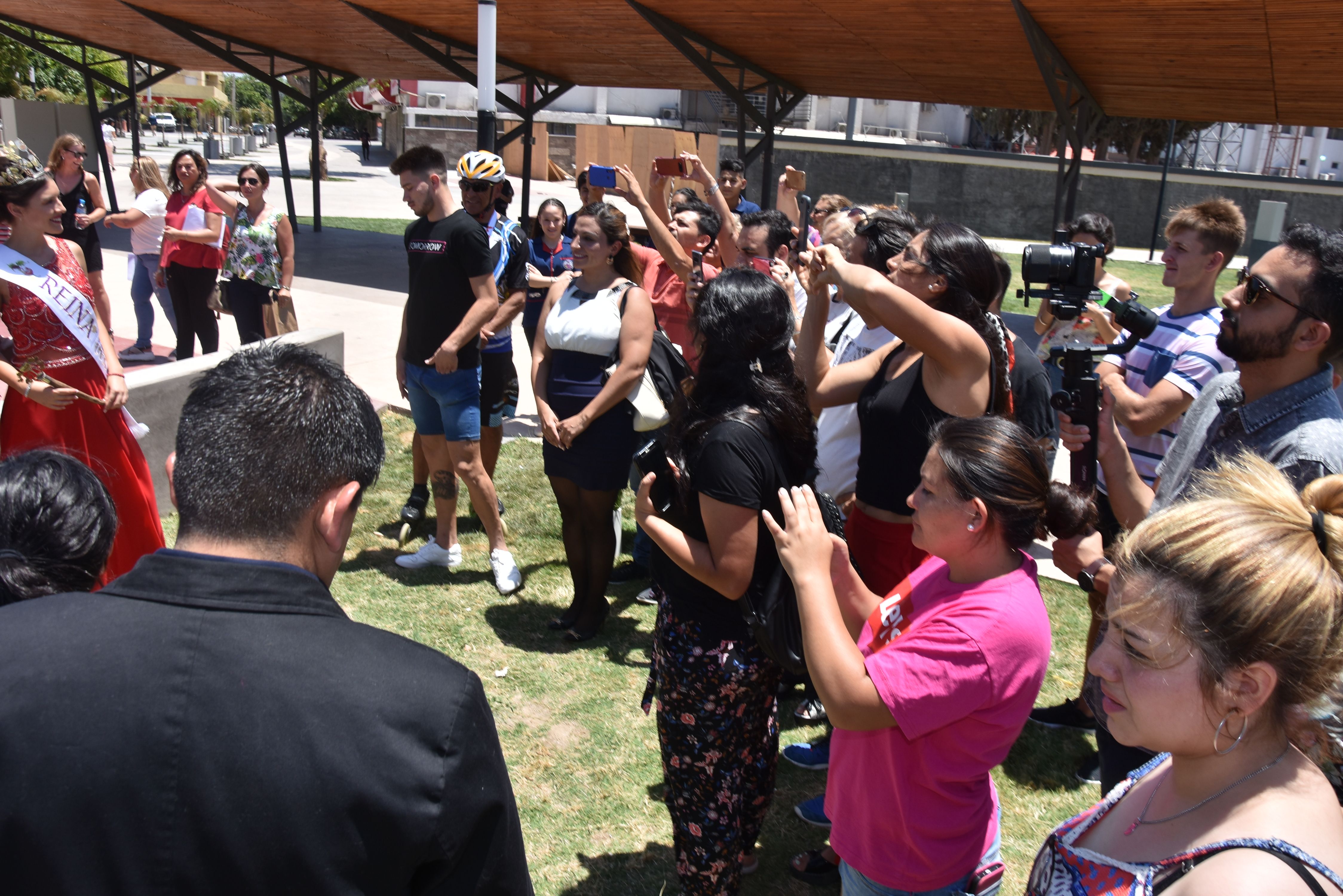 2 fuentes con cascada tiene el espacio verde donde fue realizada la producción de fotos. Una de ellas está ubicada cerca del estadio Aldo Cantoni, mientras que la otra fue parte principal de la fotografía. Es que está en los pies del Monumento al Deporte. Estas cascadas llamaron la atención de los protagonistas, quienes se sacaron selfies para subir a las redes sociales.