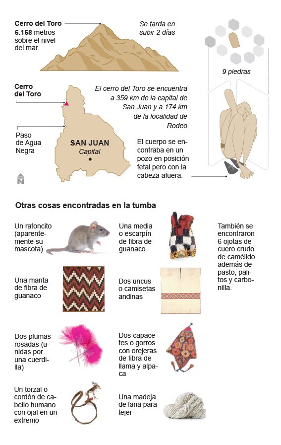 No había ninguna documentación de ningún tipo sobre el cerro del Toro. Los expedicionistas del Andino Mercedario creían que pasarían a la historia por ser los primeros en hacer cumbre en él (6.168 msnm). El 26 de enero de 1964 Erico y Antonio fueron los primeros en llegar. Pero la historia sería otra. “Al llegar a la cima del cerro del Toro, sentí el místico recogimiento de quien entra en una iglesia, percibí alrededor la misma paz; tuve deseos de rezar, y despacio murmuré: ‘Dios… Señor’. Y supe, antes de verlo, que él estaba allí. Avanzamos 50 pasos más y vimos al borde de un pequeño lomo una pirca rectangular. Su lado norte, de algunos metros de largo y de tal vez 40 o 50 centímetros de alto, se destacaba neto contra el cielo. “¡Sabía que aquí hallaríamos algo!”, exclamó Groch, y apurando el paso se adelantó un poco… y se paró al lado de un círculo formado por nueve gruesas piedras, en cuyo centro se destacaba una cosa blanca… ‘Parece una calavera’ dijo Groch y probo levantarla. Con ambas manos tiré del objeto blanco, pero este permanecía firmemente pegado al suelo. Puse entonces las dos máquinas fotográficas que llevaba a un costado y removí las piedras del círculo, dejando visibles los hombros y dos rodillas que asomaban a ras del suelo. ‘¡Mire!, huesos…’. Me tiré de bruces para ver de cerca la calavera, y he aquí, a 30 centímetros, la cara de un indígena que me miraba con expresión dulce. Una tremenda sacudida me estremeció… ¿Dónde había yo visto antes esa cara? me resultaba vagamente familiar y sin embargo nunca había estado allí antes. Quise hablar y no pude. Al fin lloré. ‘¿Qué hay?’ preguntó Groch, impaciente. ¡Un indígena!, dije al fin”. (Antonio Beorchia Nigris / DIARIO DE CUYO).