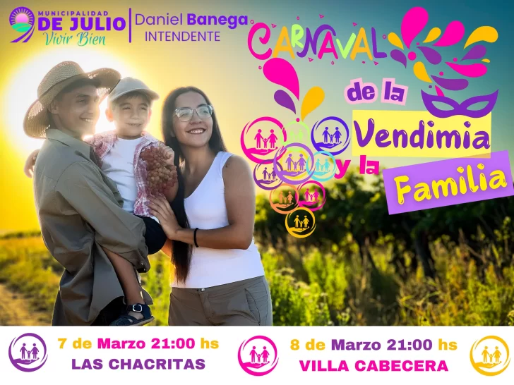 Este viernes 7 en Las Chacritas y sábado 8 en su Villa Cabecera, desde las 21 horas, 9 de Julio celebrará su Carnaval de la Vendimia y la Familia, con destacados artistas nacionales y locales, corso, comparsas y murgas locales e invitadas, elección de reinas, y muchas sorpresas más, en el marco también especial del Día Internacional de la Mujer. El desdoblamiento del evento en dos noches busca favorecer a la economía familiar y circular de los vecinos, emprendedores y comerciantes del departamento. En esta edición, la entrada es libre y gratuita.