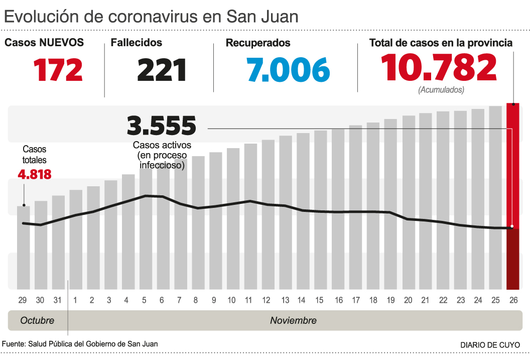 Sin embargo, noviembre lo va a superar. En lo que va del mes ya fallecieron 117 sanjuaninos y entre las víctimas hay personas de poco más de 30 años. Tuvieron que sumar camas críticas en los hospitales públicos y centros de salud privados y los casos en este tramo del mes ya suman 5.352; cuando hasta el último día de octubre el acumulado era de 5.430 contagios. Fueron 100 días de un duro golpe con la realidad.