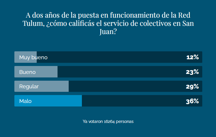 Si bien desde ese entonces, tanto los recorridos como las paradas fueron mutando, a dos años de la puesta en funcionamiento de la Red Tulum, los sanjuaninos calificaron el servicio. En este sentido, de un total de 16.264 votos, un 65% se agrupó entre las opciones "malo" y "regular" mientras que un escaso 35% tildó entre "muy bueno" y "bueno".