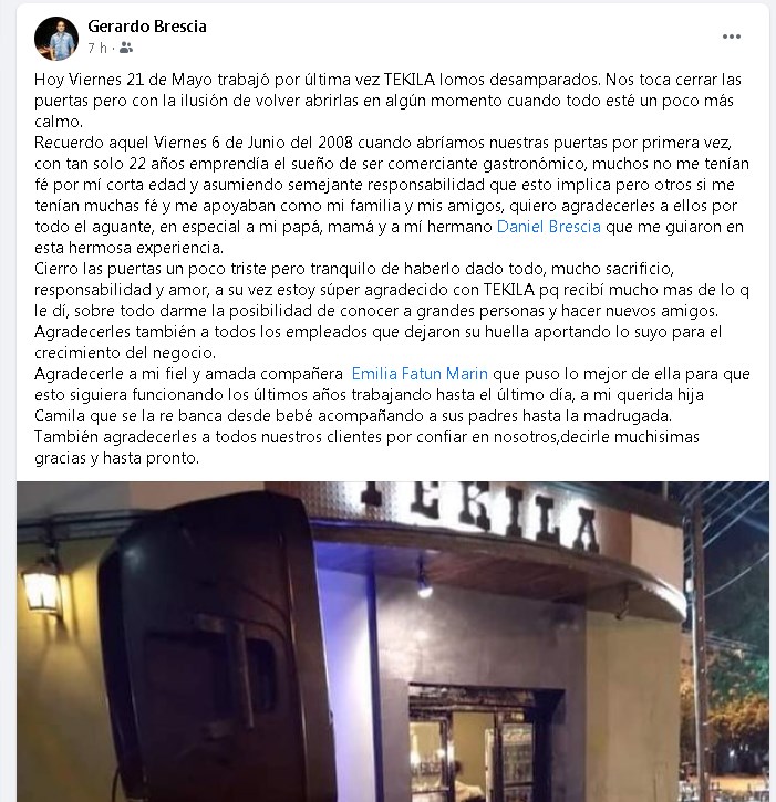 El dueño del local "Tekila", realizó un posteo en redes sociales informando sobre el cierre en virtud de las dificultades sufridas desde el inicio de la pandemia. "Cierro las puertas un poco triste pero tranquilo de haber dato todo con mucho sacrificio y responsabilidad", indicó Gerardo Brescia en sus redes sociales.