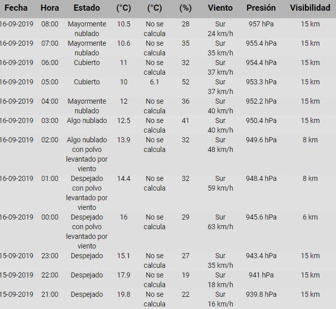 Poco antes de las 23 del domingo desde la Dirección de Protección Civil se emitió un alerta por el ingreso de un frente frío con ráfagas moderadas del sector Sur. Sin embargo, una hora después los sanjuaninos se sorprendían con la llegada de un fuertísimo viento acompañado de tierra. Según el registro del Servicio Meteorológico Nacional, a la medianoche las ráfagas fueron de 63 kilómetros por hora con una visibilidad de sólo 6 kilómetros.