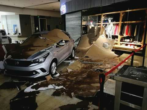 En la imagen puede observarse que el auto de exhibición de una concesionaria quedó tapado por materiales que cayeron desde el techo. Afortunadamente no hubo personas heridas por el accidente.