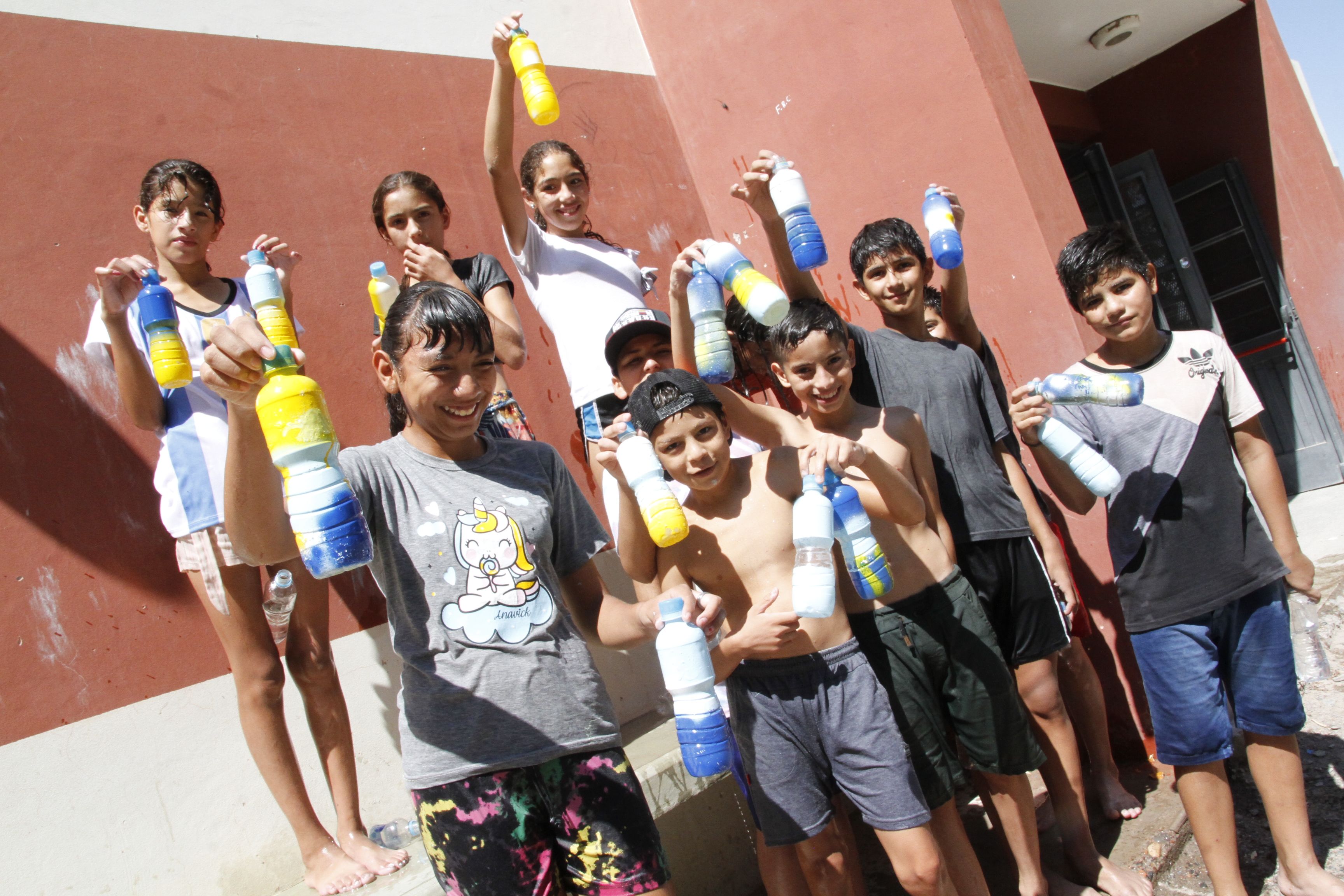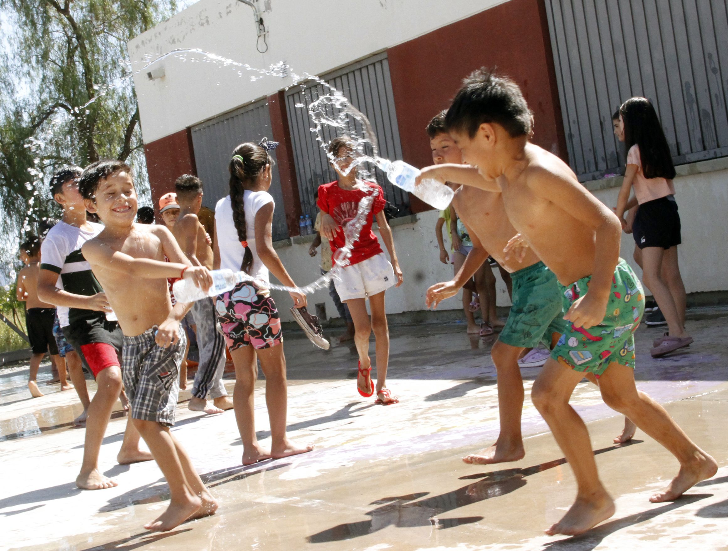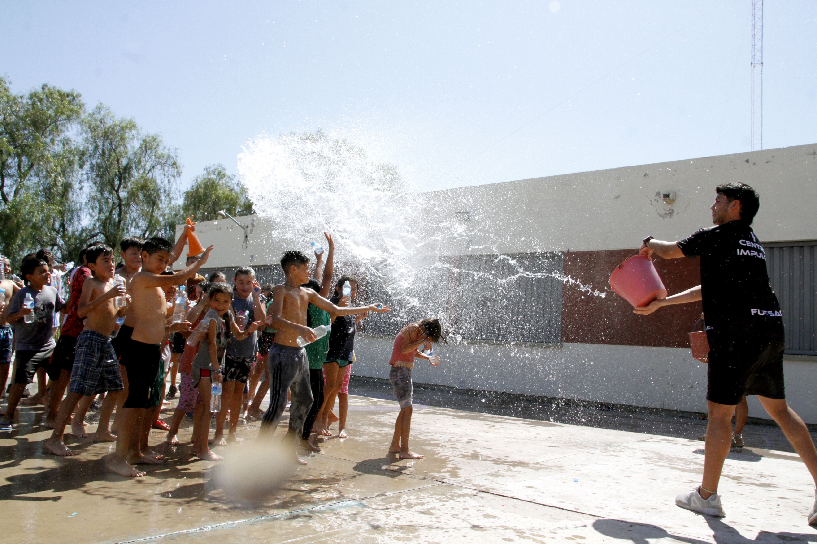 Primero, participaron de un juego con baldes, conos plásticos y mucha agua. Eso fue el prólogo del momento más deseado. Es que después, los baldazos y las botellas usadas como pomos hicieron que los niños no quisieran detener ese momento. Los profesores dijeron que esa postal la repiten casi todos los días para que los niños se refresquen.