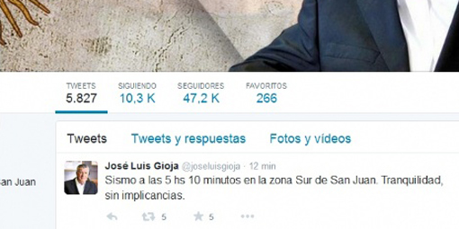 San Juan, 12 de septiembre.- Tiempo después que ocurriera el fuerte sismo, el gobernador José Luis Gioja utilizó su cuenta de Twtter para pedir "tranquilidad" y aclarar que no hubo "implicancias".