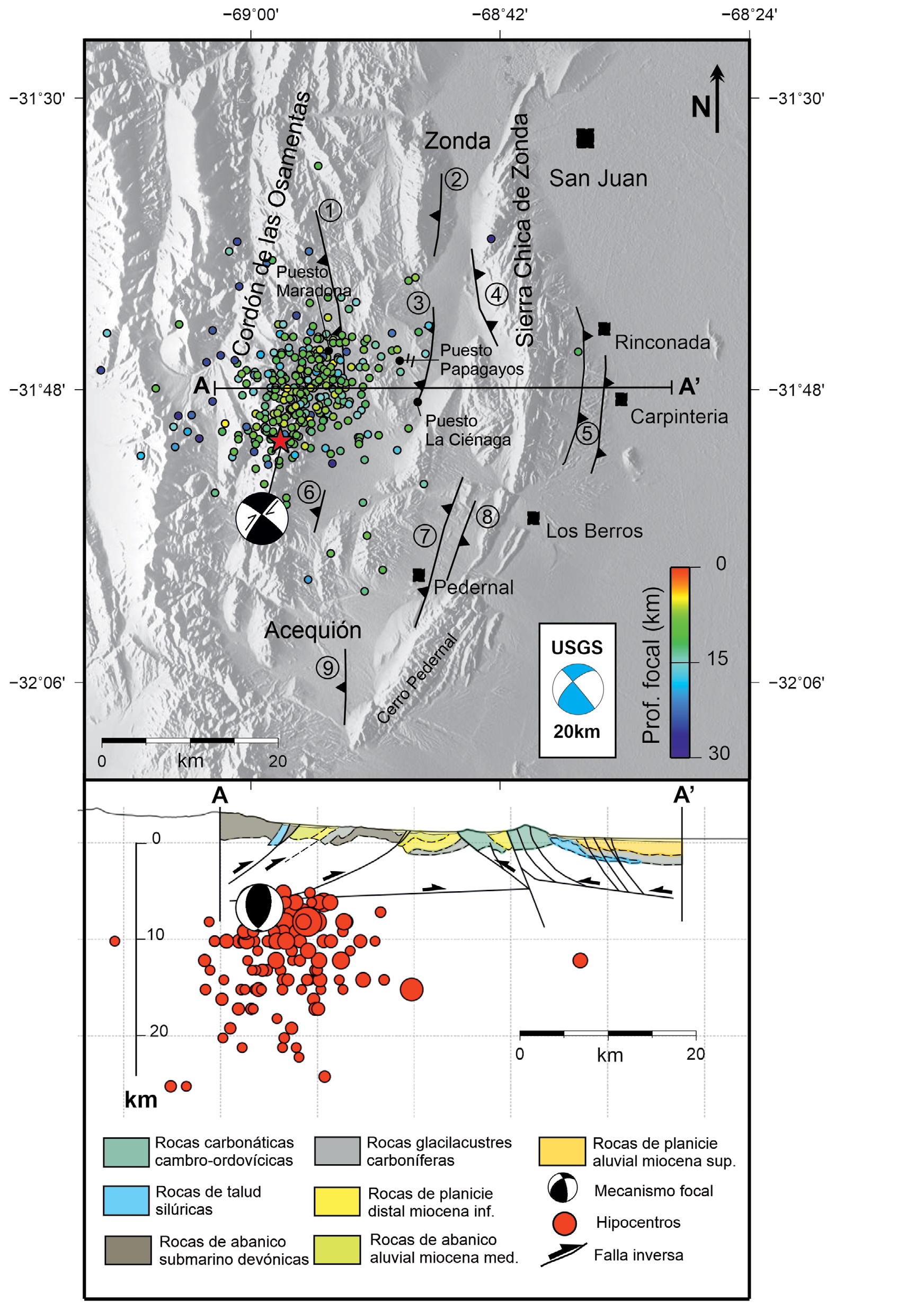 En el corredor tectónico Zonda-Maradona-Pedernal es posible reconocer un sistema de fallas con actividades cuaternarias (desde hace 2,59 millones de años hasta el presente); algunas de esas fallas son visibles en superficie sobre la ladera este del Cordón de las Osamentas, lugar del epicentro. Este sitio forma parte de la zona de contacto entre la Precordillera Central y la Oriental, dando origen a un sector intensamente plegado y fallado debido al acortamiento de la corteza levantada durante las últimas etapas de la formación de la cordillera de los Andes.