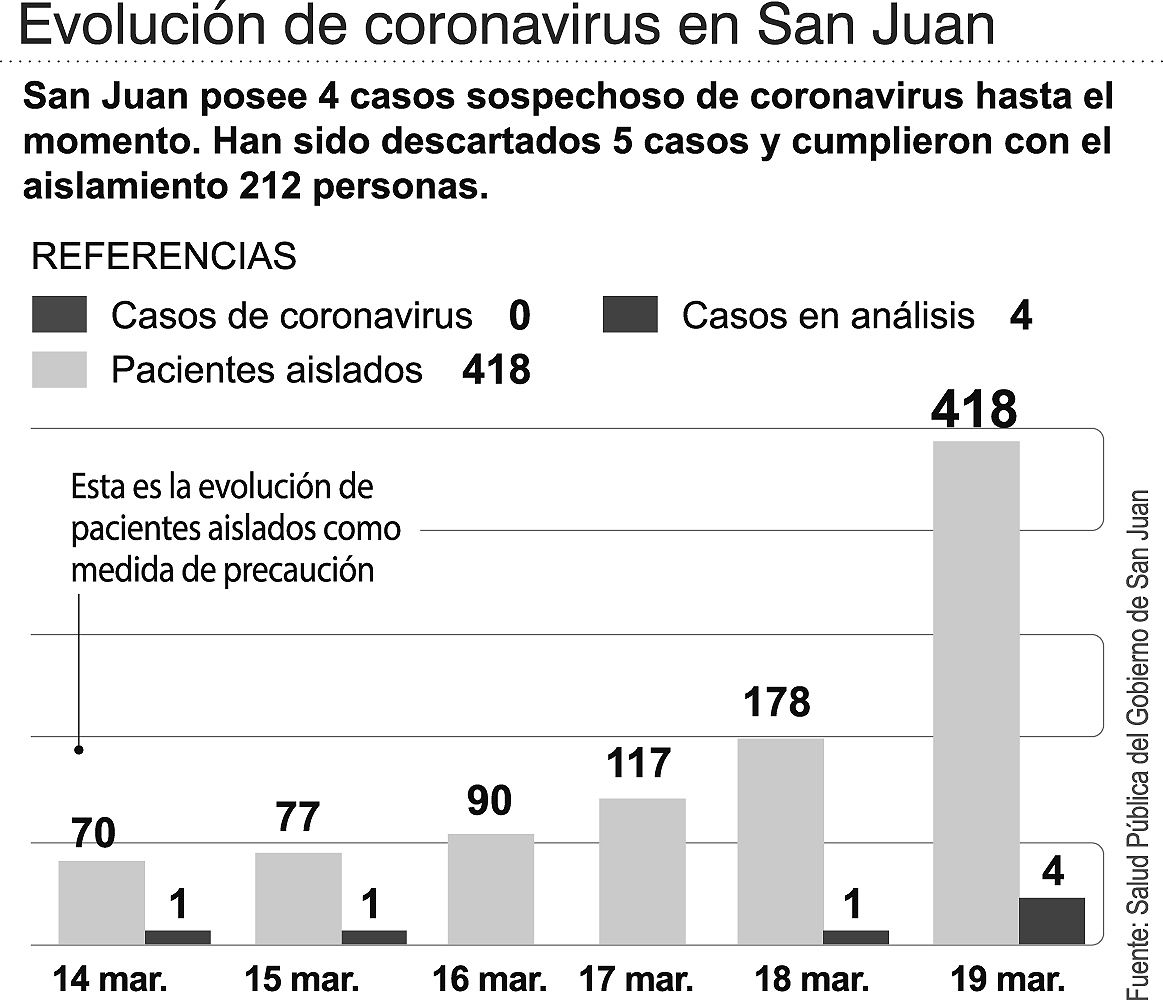 Además que representa hasta ahora la mayor cantidad de casos en estudio, desde la cartera también señalaron que ayer, a las 18,30, eran 418 las personas que se encontraban aisladas,lo que significó un incremento del 134% en 24 horas, respecto a las 178 que informó antenoche el gobernador Sergio Uñac.
