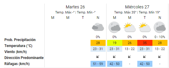 Su procedencia será del sector Noreste y las temperaturas volverán a ser bastante elevadas. La mínima pronosticada será de 19 grados y se aguarda una máxima de 35. Las ráfagas volverán a ser protagonistas del ambiente durante la tarde, con una velocidad estimada de hasta 50 kilómetros por hora.
