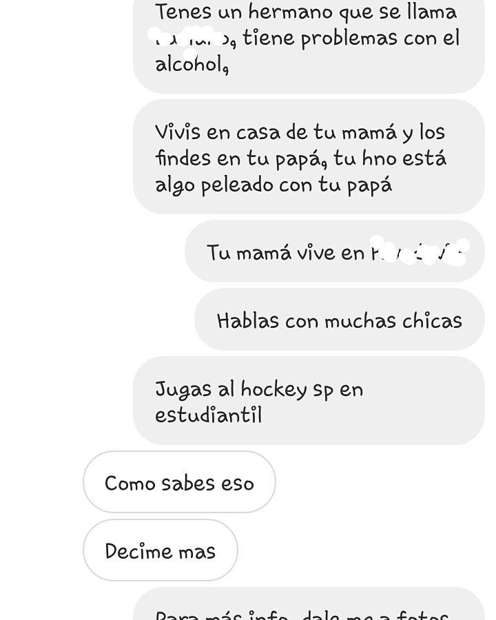 Esas aplicaciones generan estos chats inventados, en los que después se puede tachar -para simular cierta desprolijidad casual- los supuestos nombres y caras. Así, cualquiera puede convertirse en un "adivinador" si empieza a autopromocionarse como tal y le pone creatividad a la ficción de la conversación.