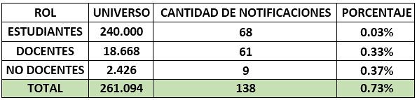 La totalidad se divide del siguiente modo: un 0,03% en estudiantes, un 0,33% en docentes y el 0,37% en no docentes.