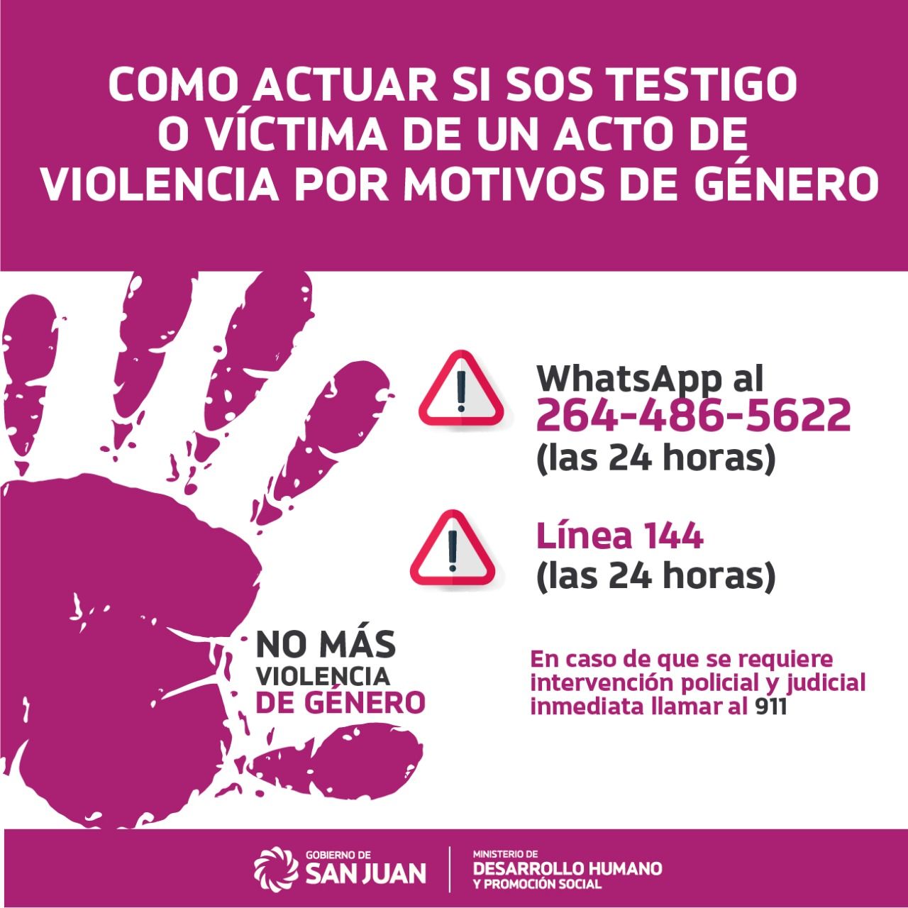 Desde el fin de semana pasado, un caso de violencia de género que fue filmado por testigos en medio de un bar, genera estupor en la sociedad sanjuanina. Ahora, en medio de la repercusión del caso, desde el Ministerio de Desarrollo Humano enviaron un comunicado recordando qué hacer en caso de ser testigo o víctima de un hecho de este tipo. "Si ves que agreden a una mujer o alguien del colectivo de la diversidad, escuchas insultos o presencias cómo la atacan, no mires hacia otro lado", pidieron.