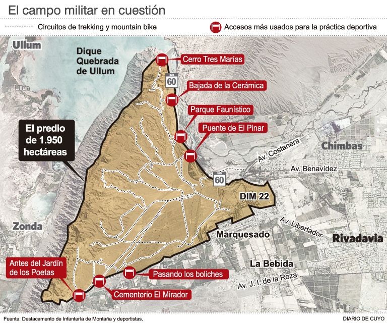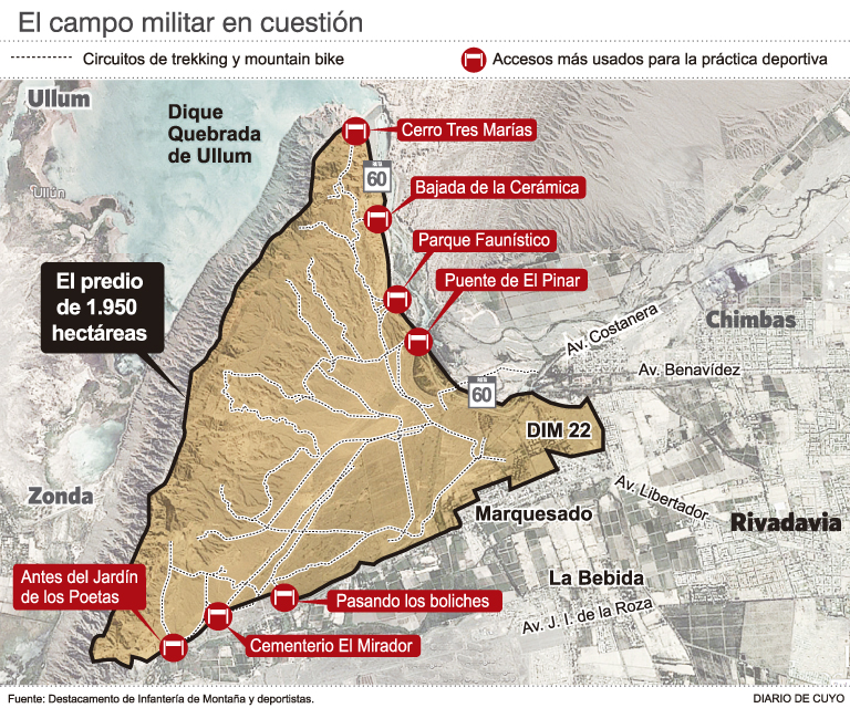 Héctor Bustos, presidente de la Asociación Sanjuanina de MTB, afirmó que recuerda que al menos hace 25 años que se practica deporte en ese predio y que cada vez se intensifica más su utilización. "Para nosotros es un terreno casi urbano, que nos queda casi a mano. Y no creo que sea de utilización militar más de 10 días al año", afirmó el dirigente deportivo que adelantó que ante el impedimento que de ingreso que sostienen las guardias militares, se reunirá con otras agrupaciones de trekking para plantear de forma conjunta un reclamo a la Secretaría de Deportes para que interceda ante las autoridades militares.