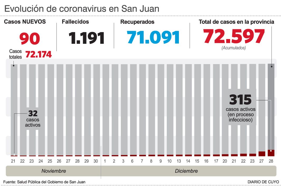 El Ministerio de Salud Pública informó ayer que fueron detecta­dos 90 casos de covid, la cifra dia­ria más alta desde agosto. Así, los contagios siguen en aumento en medio de la confirmación de la circulación comunitaria de Delta y la sospecha de Ómicron, las dos variantes más infectivas. Los 90 casos de ayer, en tanto, ca­si igualaron a todo noviembre, que acumuló 91.
