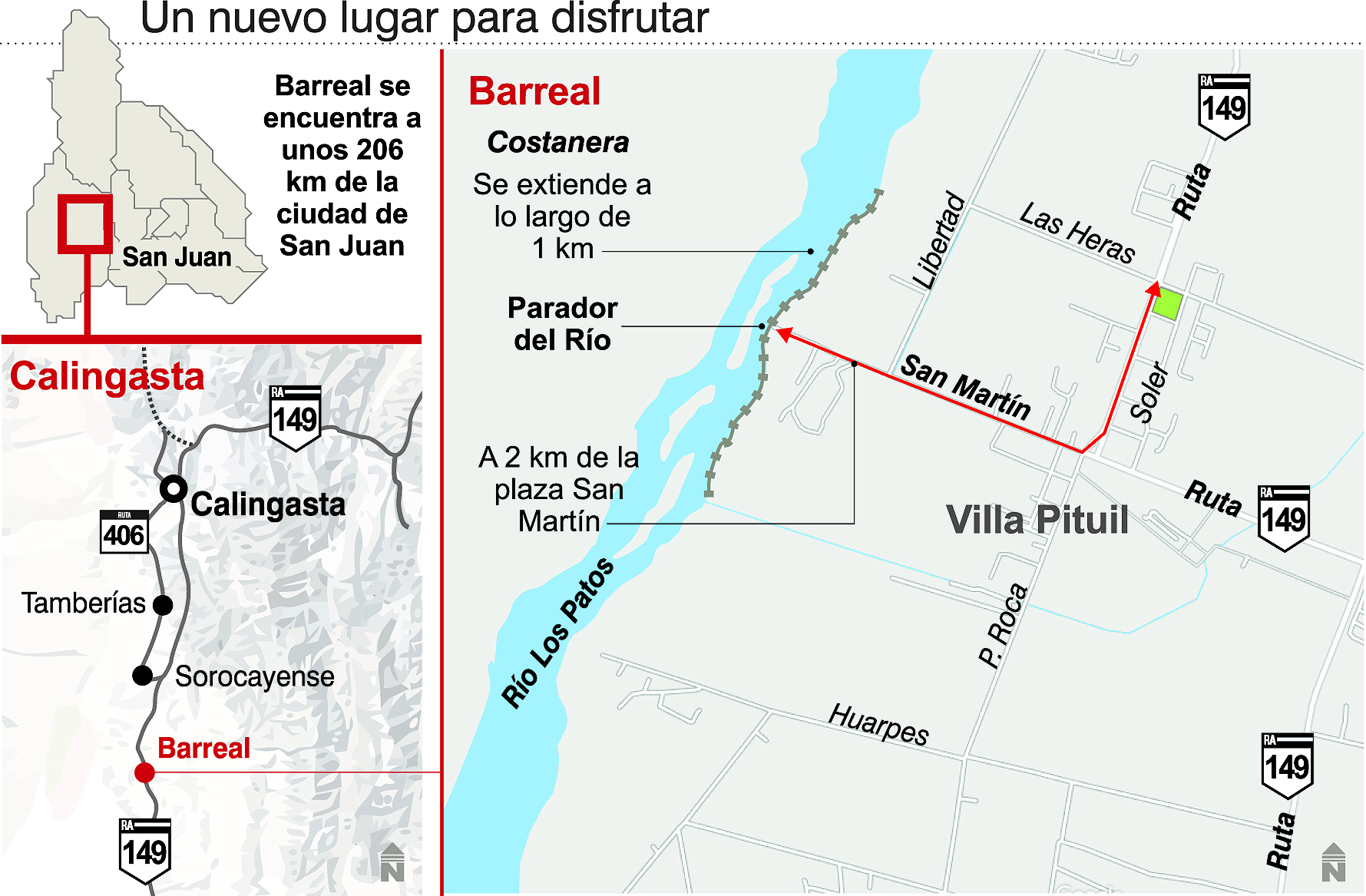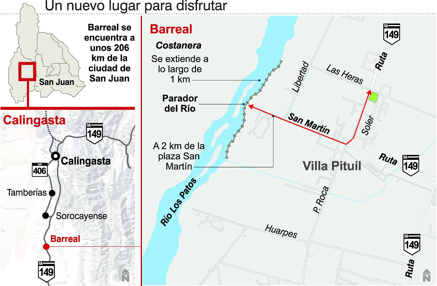 Actualmente, la costanera cuenta con un sector de estacionamiento, un mirador donde se puede apreciar el cerro Mercedario y el Cordón de La Ramada, un sector donde realizar el tradicional fogón a la vera del río, iluminación y una cancha de vóley playero, todo en pleno corazón de Barreal y cerca de los servicios públicos necesarios. "El sector de la costanera habilitado para el uso turístico queda a dos minutos de Barreal en auto. La calle San Martín, arteria principal de esta localidad, topa en la costanera. Cerca de este zona hay una estación de servicio, un centro de salud y una comisaría, por lo que el visitante puede acceder a cualquiera de estos servicios sin ningún inconveniente, otro de los factores que contribuyeron a su auge turístico", sostuvo Tapia.