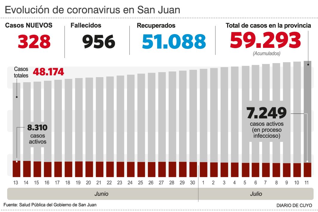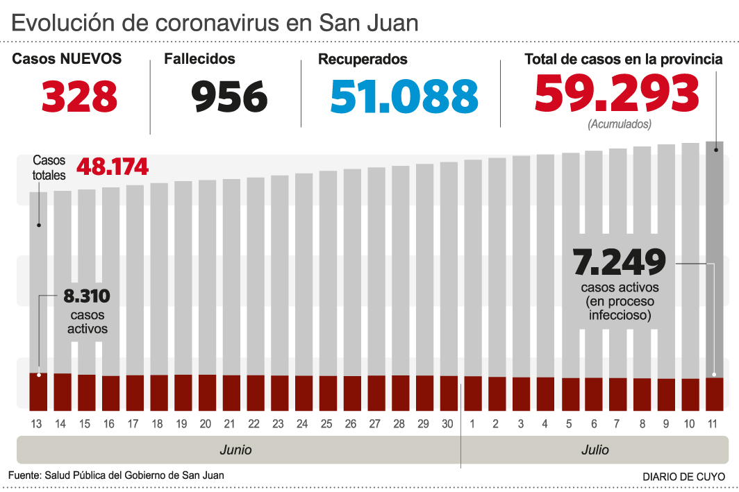Según Salud Pública, ayer en San Juan se registró un solo fallecimiento por covid, de un albardonero de 79 años. Además, se sumaron 328 casos de coronavirus a la estadística provincial, que ya acumula casi sesenta mil desde el inicio de la pandemia. Por otro lado, hay 239 pacientes internados.