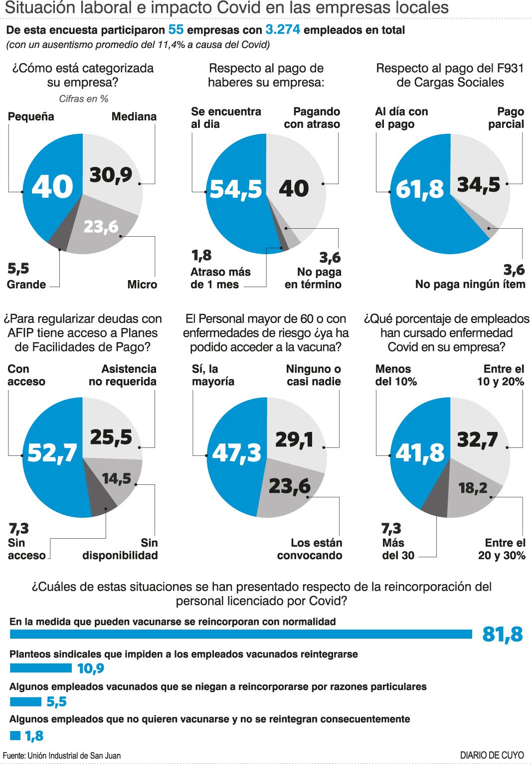 Un estudio realizado durante el mes de abril por la Unión Industrial de San Juan (UISJ), sobre la situación laboral y el impacto Covid, reveló que, a pesar de no tener restricciones para trabajar, más de la mitad de las empresas -el 62%- tiene dificultades financieras para el pago de sueldos y de las cargas sociales de sus trabajadores. Sólo un 38% respondió que no necesita ningún tipo de ayuda para el pago de haberes al personal. El resto sí lo necesita pero no puede recurrir a la ayuda nacional a través del Repro II porque las exigencias son inalcanzables, aseguran. El sondeo que también apuntó a la situación sanitaria dice que en el último mes crecieron 20% los contagios de los trabajadores.