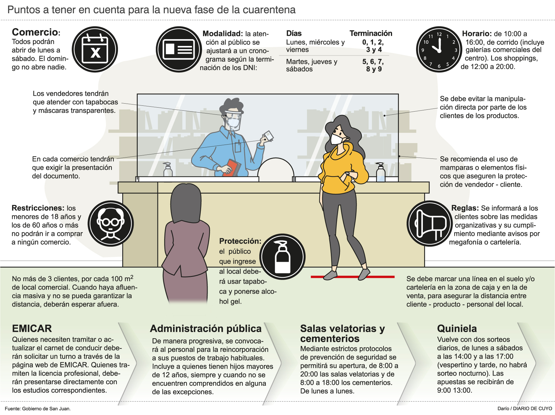 Aunque la cuarentena sigue vigente, la provincia de San Juan ingresa a partir de hoy a una nueva fase de actividad con la reapertura de los comercios y shoppings bajo estrictas pautas de distanciamiento e higiene (ver infografía superior). Con este sector que se suma a los que paulatinamente fueron reactivándose en la flexibilizacion de la cuarentena por el coronavirus ya sólo quedan en espera aquellos relacionados al entretenimiento y a la actividad del turismo de eventos.