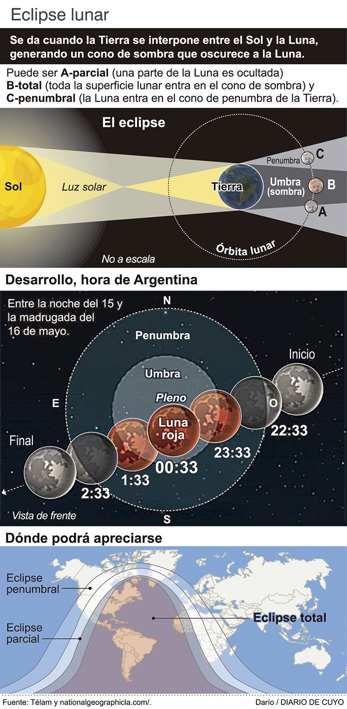 Hoy, el Sol, la Tierra y la Luna se alinearán en el cielo, de forma tal que se producirá la llamada "Luna de sangre". Esto es cuando el satélite natural adopta un color rojizo y modifica la iluminación de la noche. Este eclipse no se volverá a manifestar hasta marzo de 2025, por eso la importancia. Los especialistas explicaron que la duración del evento será de 5 horas y 18 minutos y, en esta oportunidad, no se necesitará elementos especiales para observarlo. Y si bien todos lo podrán ver desde su casa, en la provincia habrá actividades para disfrutarlo de una manera diferente. A continuación una guía con lo que se puede realizar.