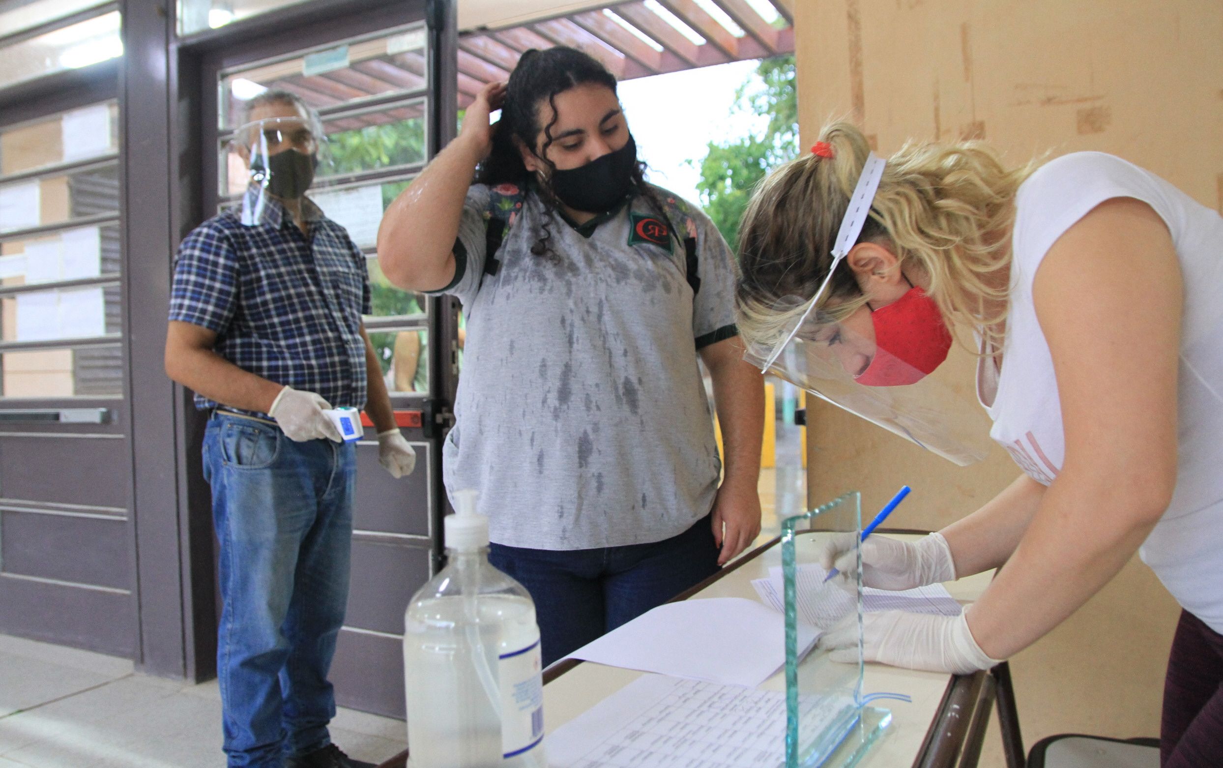 Controles. En la puerta de las escuelas hubo personal tomando la temperatura y los datos de cada uno de los alumnos que ingresaron a los establecimientos.