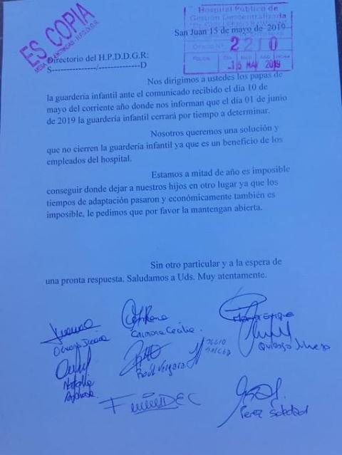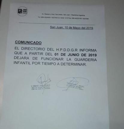 Todo comenzó el pasado 10 de mayo, cuando salió un comunicado de las autoridades del hospital que indica que: “El directorio indica que a partir del 1 de junio de 2019 dejará de funcionar la guardería infantil por tiempo indeterminado”.