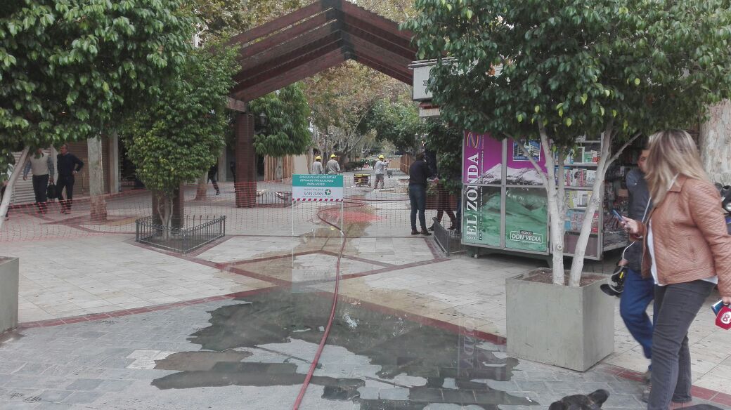 La rotura fue provocada por un martillo neumático que perforaba el piso de la Peatonal para poder colocar los postes que permitirán sostener el cerco perimetral.
