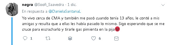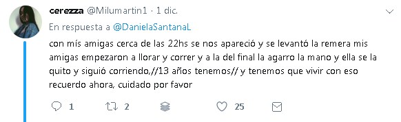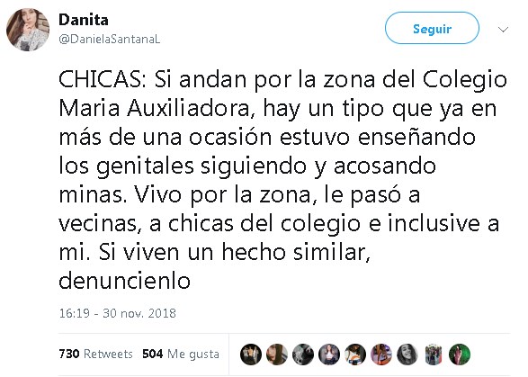 En las últimas horas, una joven denunció en su cuenta de Twitter la presencia de un depravado, que muestra sus genitales y acosa mujeres en las inmediaciones del Colegio María Auxiliadora. El mensaje tuvo una gran repercusión en las redes y varias jóvenes se animaron a contar sus desagradables experiencias con el depravado en cuestión. Todo con el objetivo de alertar a otras mujeres para que tengan cuidado si circulan por la zona.